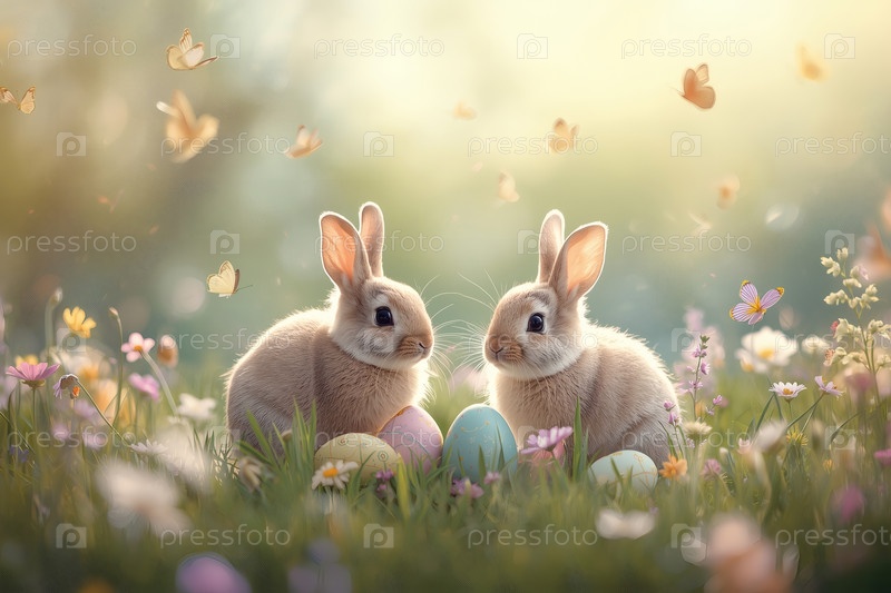 Праздничная открытка или баннер. пасхальные кролики, сидящие на траве с весенними цветами, пасхальными яйцами и бабочками. концепция счастливой Пасхи в 2026 году