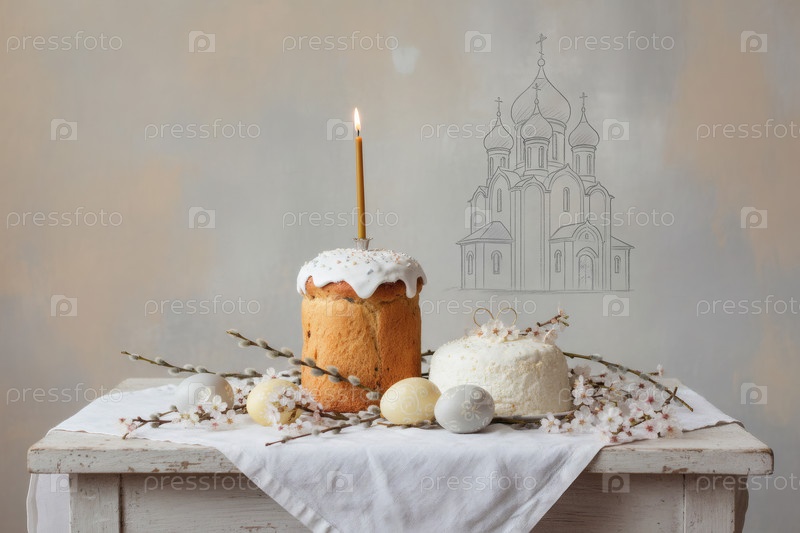 Пасхальные яйца, пасхальный торт, ива, цветы вишни и творог на серой стене с шаблоном храма.Концепция счастливой Пасхи 2026
