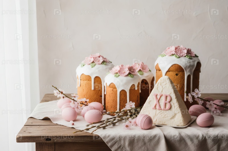 Пасхальные яйца, пасхальный торт, верба, кофейный сыр Пасха и фон сакуры с грубыми штрихами.Концепция счастливой Пасхи 2026