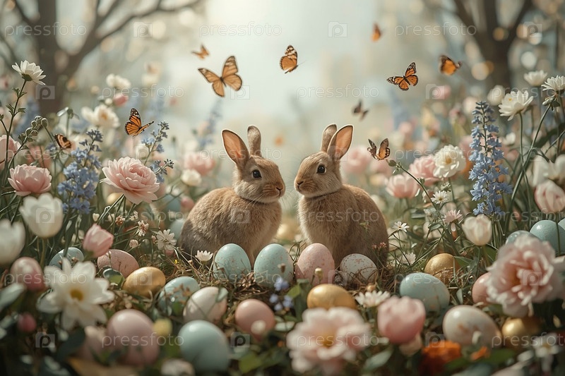 Праздничная открытка или баннер. пасхальные кролики, сидящие на траве с весенними цветами, пасхальными яйцами и бабочками. концепция счастливой Пасхи в 2026 году