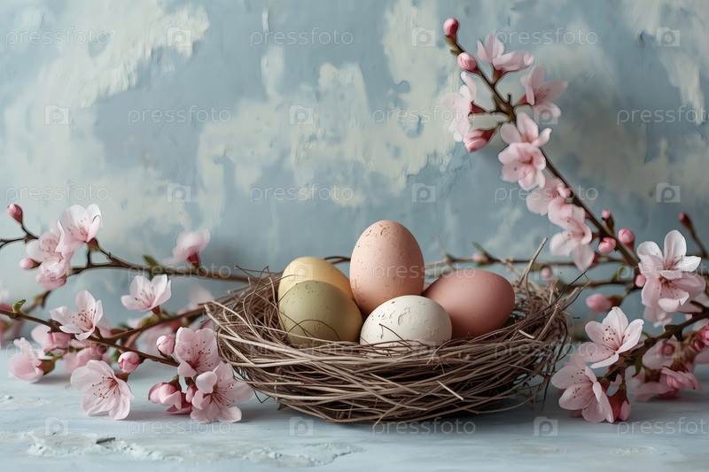 Пасхальные яйца в гнезде ветвей и нежная сакура на синем фоне с грубыми текстурированными штрихами