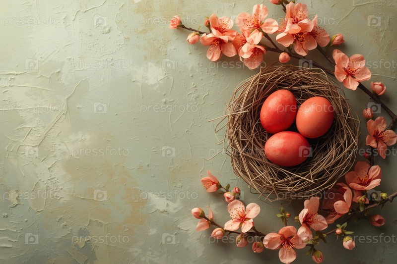Стильные пасхальные яйца в модном цвете терракоты в гнезде веток и сакуры на оливковом фоне с грубыми штрихами.Концепция счастливой Пасхи 2026