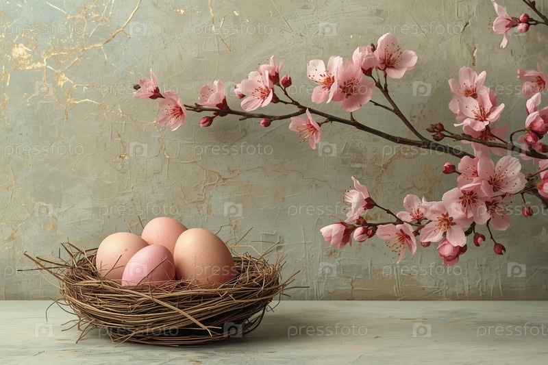 Пасхальные яйца в гнезде ветвей и сакуры на зеленом фоне с грубыми штрихами.Концепция счастливой Пасхи 2026