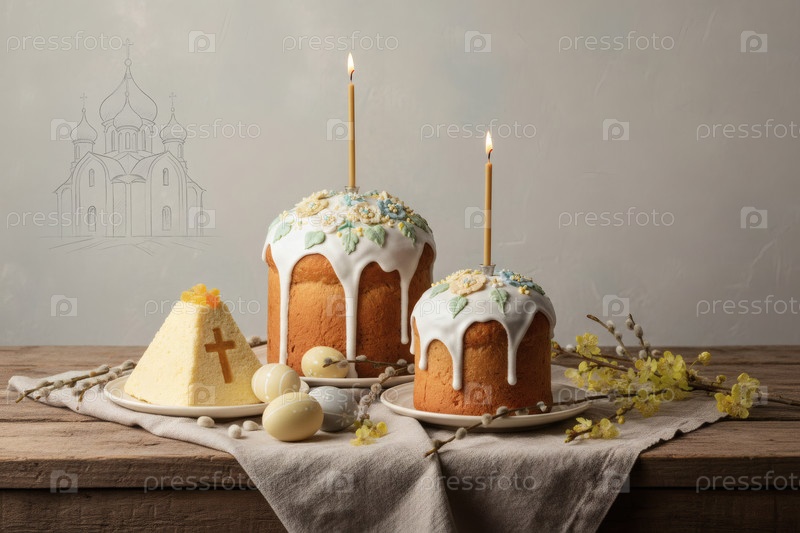 Пасхальные яйца, пасхальный торт, ива, цветы вишни и творог на серой стене с шаблоном храма.Концепция счастливой Пасхи 2026