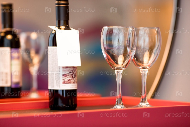 Роскошный, стильный натюрморт.Стеклянные бокалы и бутылка красного вина на бургундском столе.Концепция романтического ужина или вечеринки