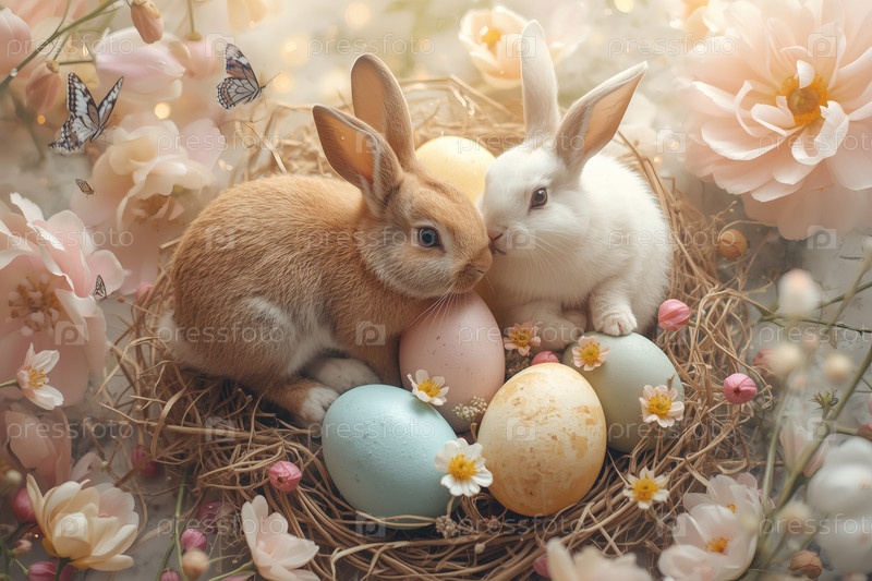 Праздничная открытка или баннер. пасхальные кролики, сидящие на траве с весенними цветами, пасхальными яйцами и бабочками. концепция счастливой Пасхи в 2026 году
