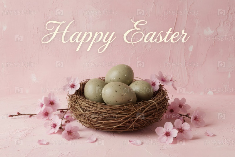 Пасхальные яйца в гнезде ветвей и сакуры на розовом фоне с грубыми штрихами.Концепция счастливой Пасхи 2026
