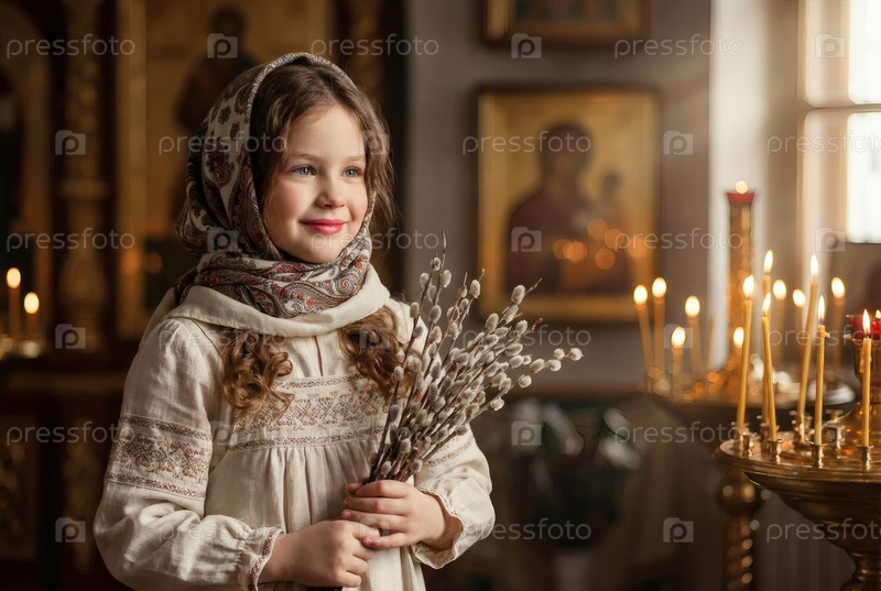 Религия и вера. Пальмовое воскресенье. Портрет маленькой девочки в русском народном плато с букетом верби внутри церкви