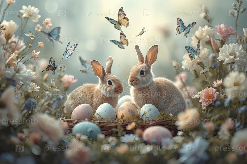 Праздничная открытка или баннер. пасхальные кролики, сидящие на траве с весенними цветами, пасхальными яйцами и бабочками. концепция счастливой Пасхи в 2026 году