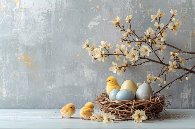 Пасхальные яйца в гнезде из ветвей, желтых птенцов и нежных цветов сакуры на серо-синем фоне с грубыми штрихами