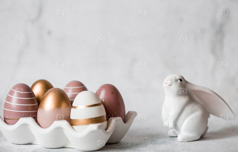 Пасхальные яйца с геометрическими узорами в бежевых и золотых тонах и пасхальный кролик.Концепция яркого праздника Пасхи 2026 года