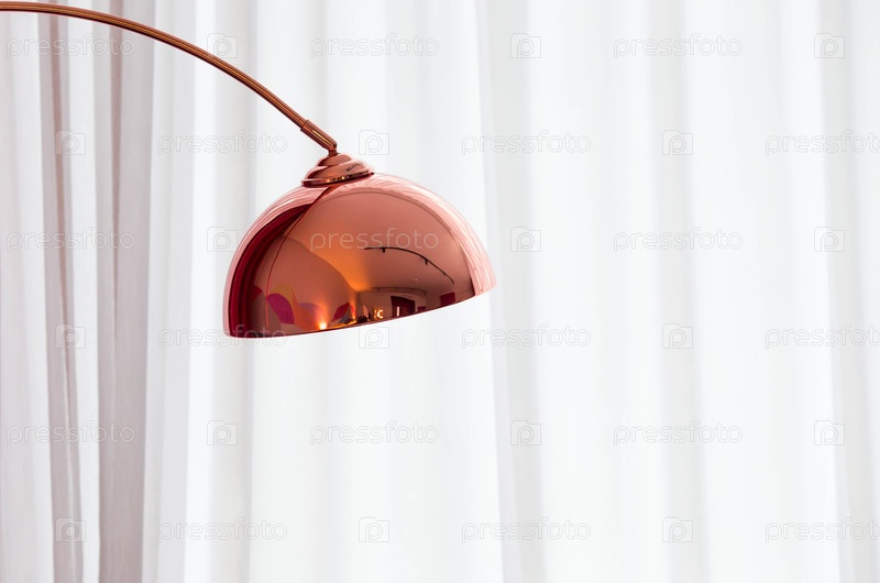 Медная напольная лампа, напольный фонарь, светильник со изогнутой ногой перед окном с белыми и красными занавесками