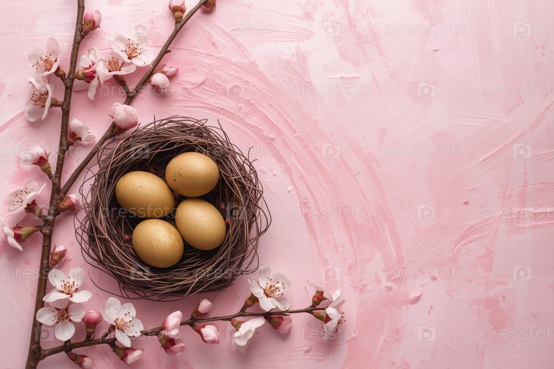 Пасхальные яйца в гнезде ветвей и сакуры на розовом фоне с грубыми штрихами.Концепция счастливой Пасхи 2026