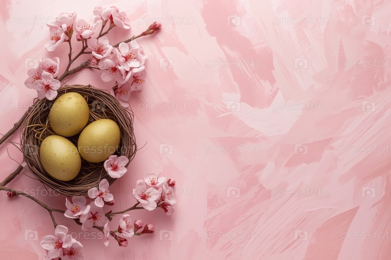 Пасхальные яйца в гнезде ветвей и сакуры на розовом фоне с грубыми штрихами.Концепция счастливой Пасхи 2026