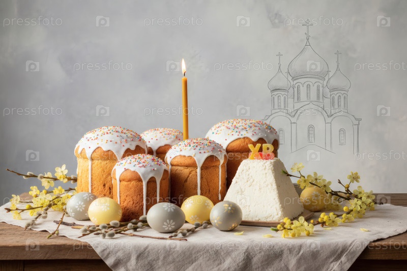 Пасхальные яйца, пасхальный торт, ива, цветы вишни и творог на серой стене с шаблоном храма.Концепция счастливой Пасхи 2026