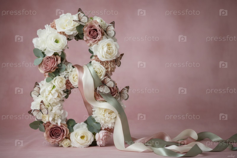 Международный женский день. баннер, флаер, красивая открытка на 8 марта. цветы в форме цифры восемь и бабочки на простом фоне