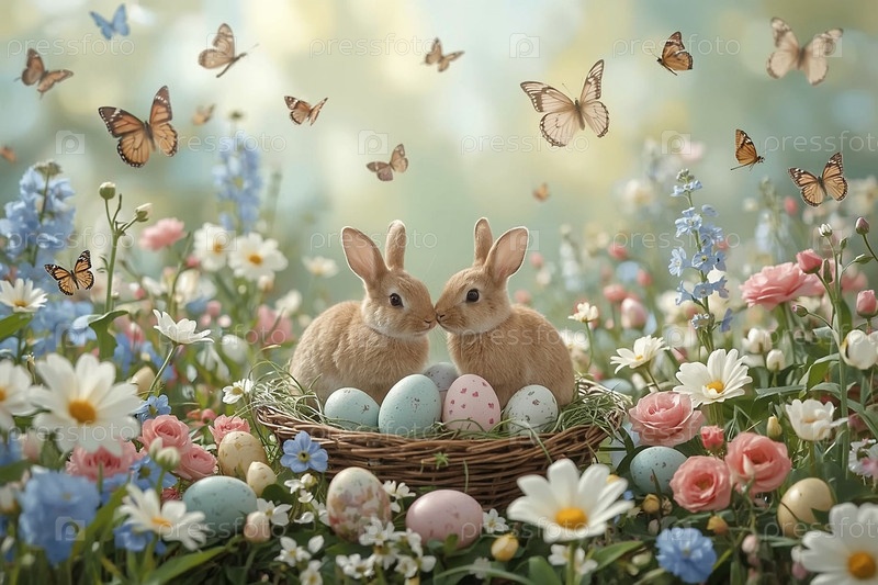 Праздничная открытка или баннер. пасхальные кролики, сидящие на траве с весенними цветами, пасхальными яйцами и бабочками. концепция счастливой Пасхи в 2026 году