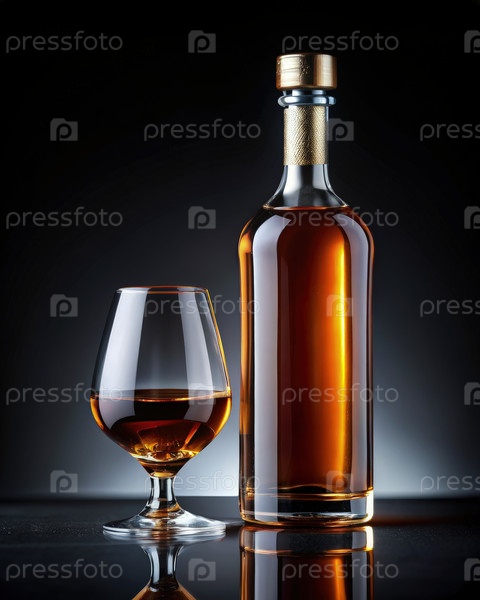 Высокая бутылка коньяка со стаканчиком на черном фоне