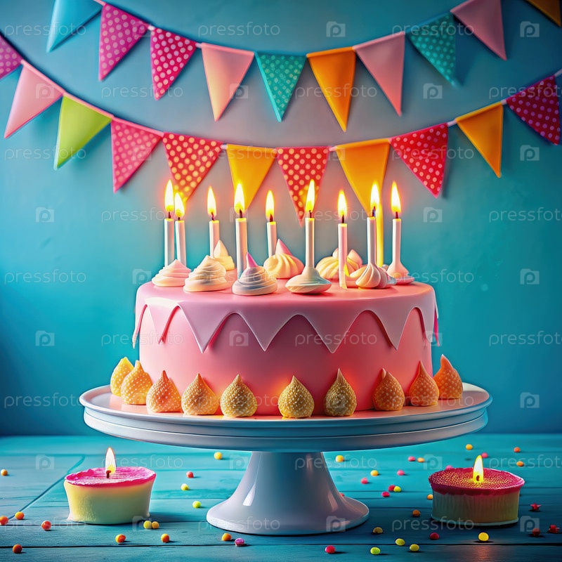 Розовый торт на день рождения со свечами и украшениями