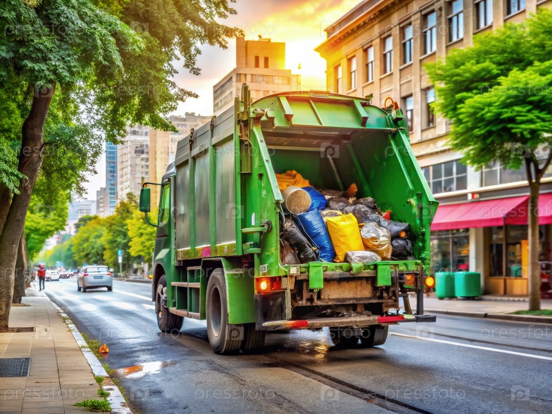 Мусорный грузовик собирает отходы на городской улице при закате солнца