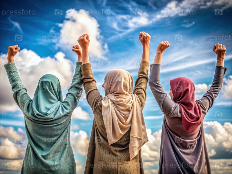 Три мусульманки поднимают руки в знак празднования против голубого неба
