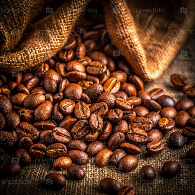 Жареные кофейные бобы, залитые из мешка на деревенской поверхности