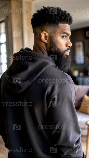 Молодой чернокожий мужчина с бородой, носящий черную толстовку, стоит в комнате