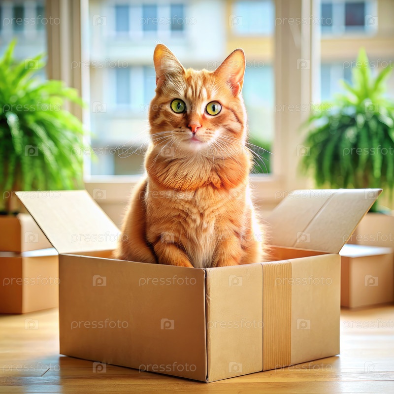 Имбирный кот сидит в картонной коробке в новой квартире