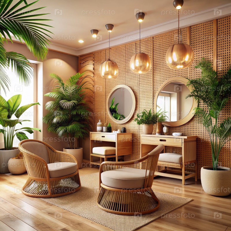 Tropical-Inspired Beauty Salon Interior с бежевыми тонами. генеративный AI
