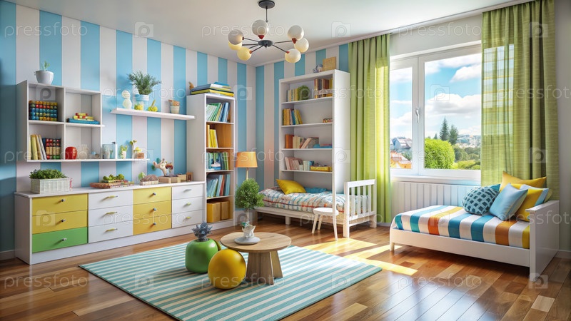 Современная детская спальня с красочным полосатым декором и большим количеством места для хранения