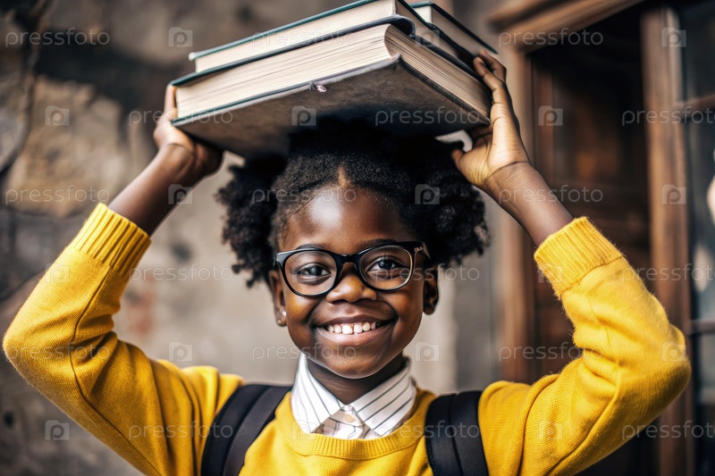 Улыбающаяся школьница балансирует книги на голове