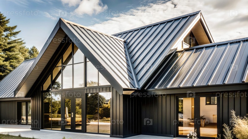 Дом с черной металлической крышей и большими окнами в солнечный день