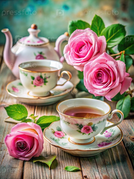 Розовые розы и чайные чашки на деревянном рустическом столе