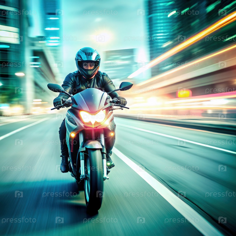 Мотоциклист едет по городу на рассвете.Генеративный ИИ
