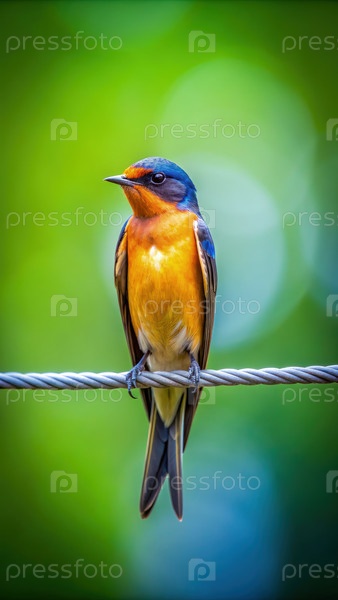 Голубая и оранжевая птица, сидящая на проводе в зеленой обстановке