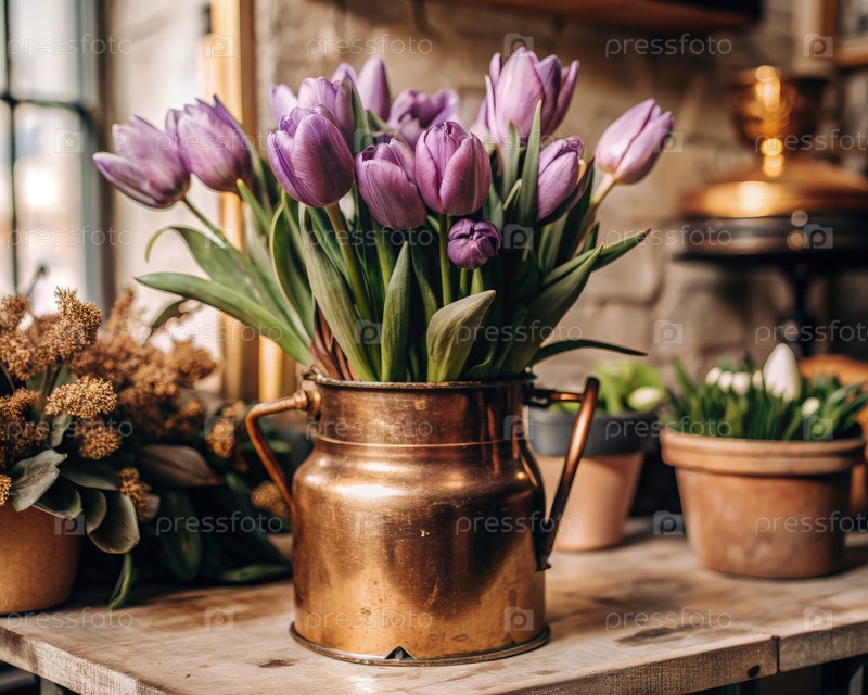 Древняя медная банка с фиолетовыми тюльпанами на деревянном столе