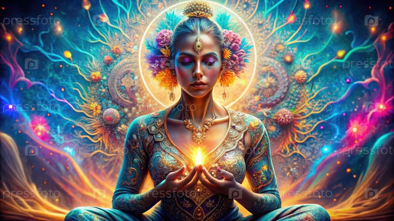 Женщина медитирует с пламенем в руках, окруженной яркими цветами