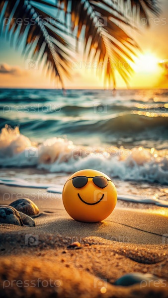 Счастливый эмодзи, носящий солнцезащитные очки на песчаном пляже при закате