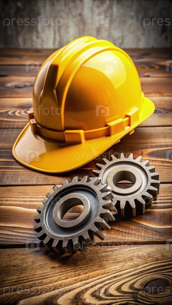 Желтая жесткая шляпа и металлические шестерени на деревянной поверхности. генеративный ИИ