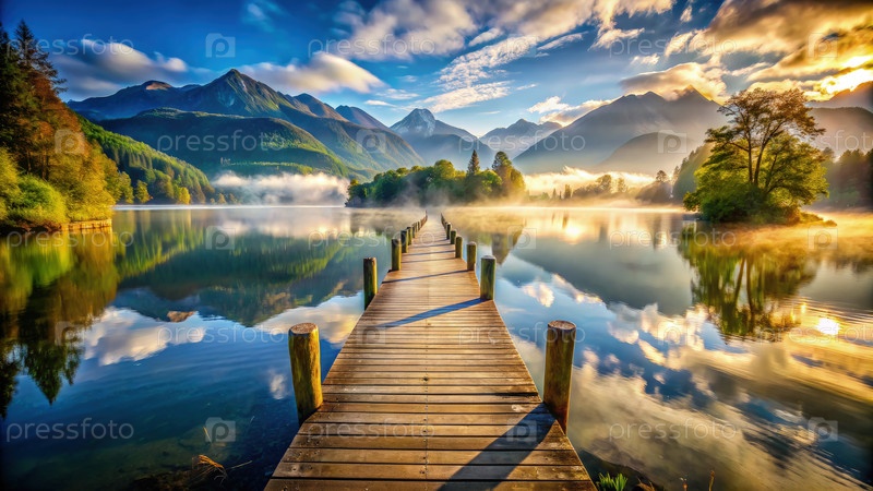 Спокойное береговое утро с деревянным пиром и туманными горами