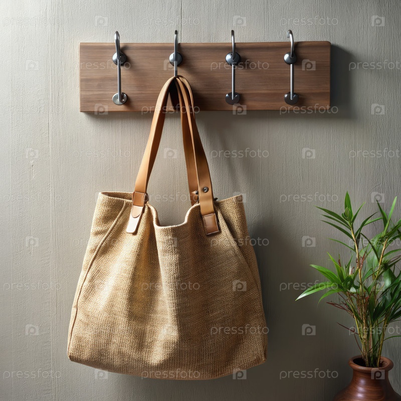 Бежевый пакет с тотами, висящий на деревянной стойке для крючков в подъезде