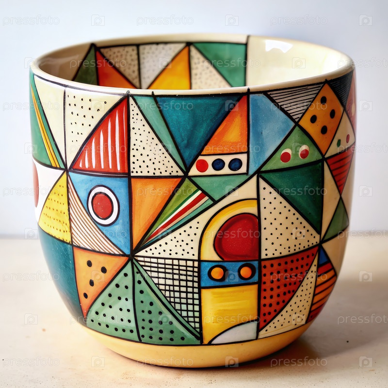 Абстрактная геометрическая керамическая чашка с многоцветными треугольниками и точками. генеративный AI