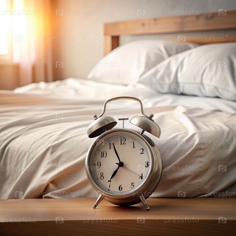 Винтажный будильник на деревянном ночном столе рядом с изготовленной кроватью