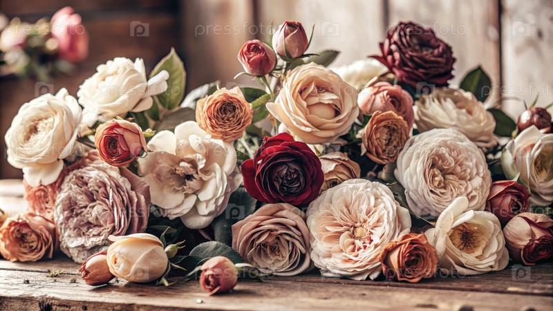 Винтажная ботаническая иллюстрация нежных роз на деревянной поверхности