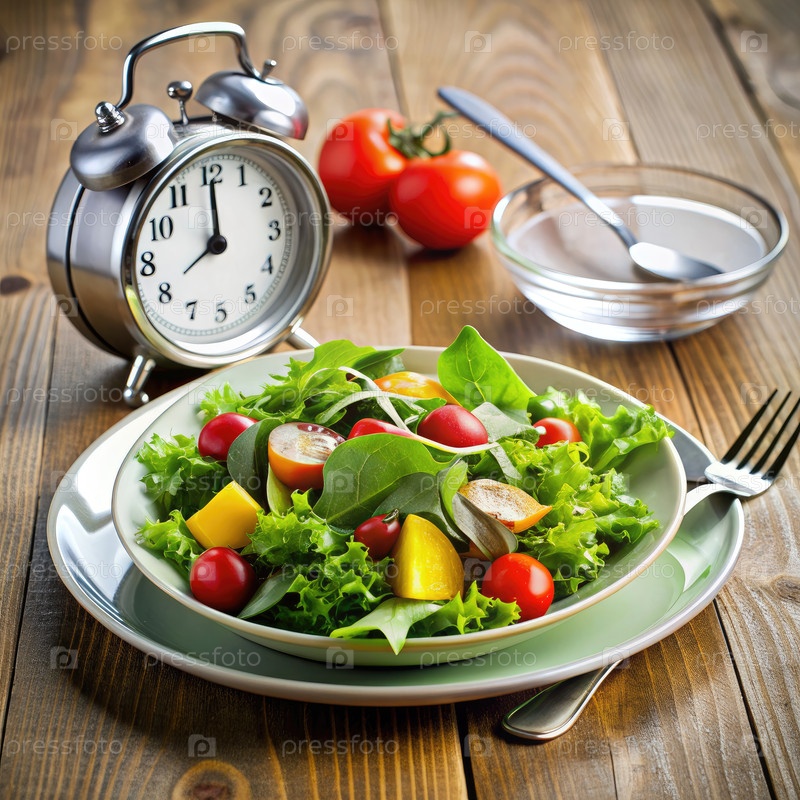 Здоровый салат для завтрака с будильником, установленным на утро: тарелка свежего зеленого салада с вишневыми помидорами, желтым перцем и шпинатом находится на деревянном столе. серебряный будильник с черным лицом настроен на 7