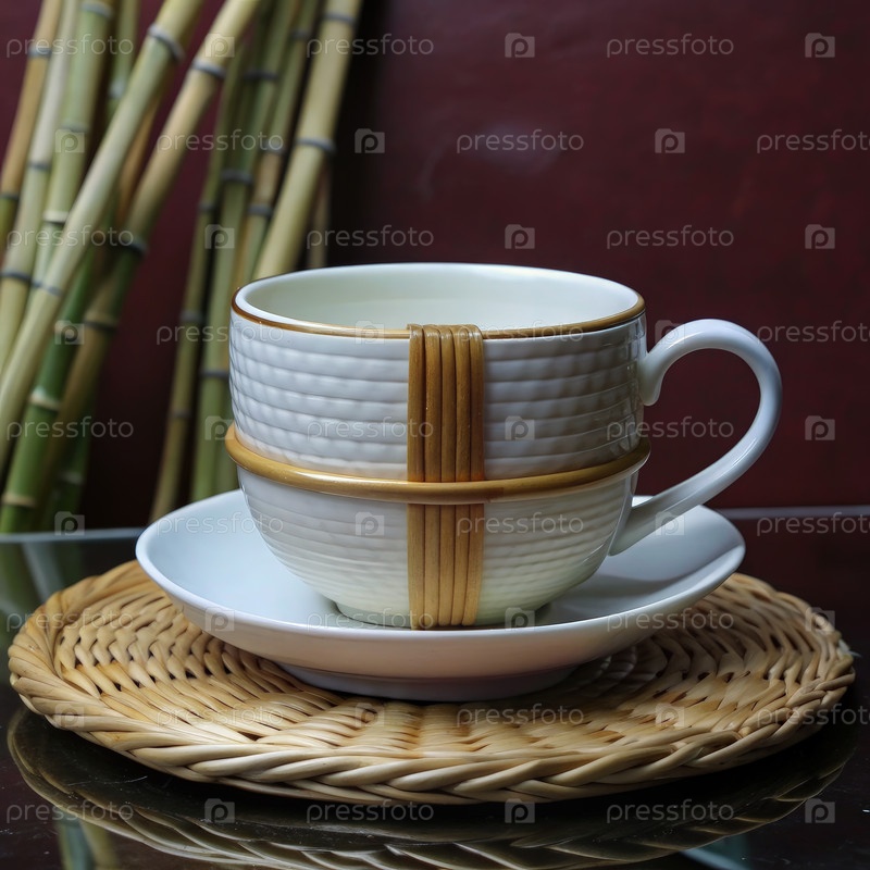 Белый чайник с дизайном из бамбука на железной дорожке. генеративный ИИ
