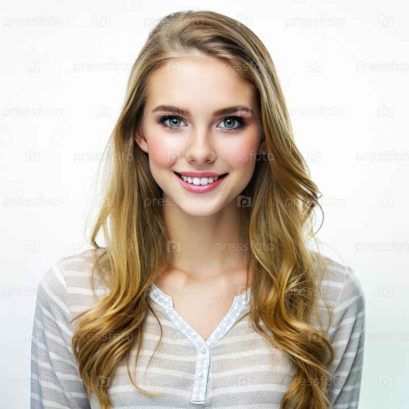 Красивая молодая женщина, улыбающаяся с длинными светлыми волосами на белом фоне