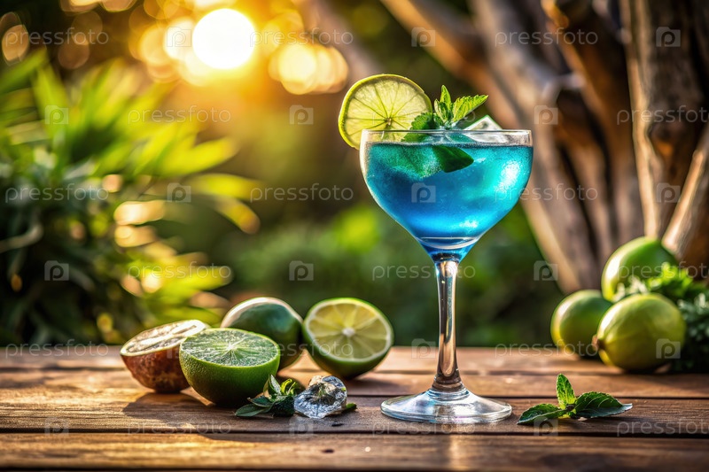 Освежающий синий коктейль с лаймом и мятой на солнечном террасе