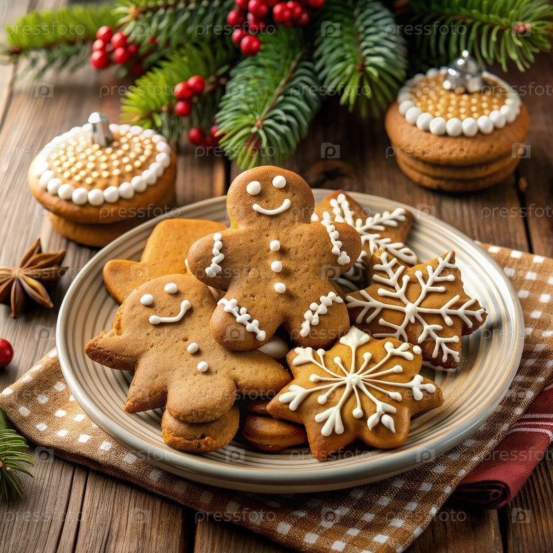 Украшенные печенье из имбирного хлеба на тарелке с праздничными украшениями