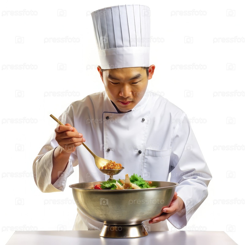 Тайский шеф-повар в белой шапке повара тщательно добавляет ингредиенты в большую чашу